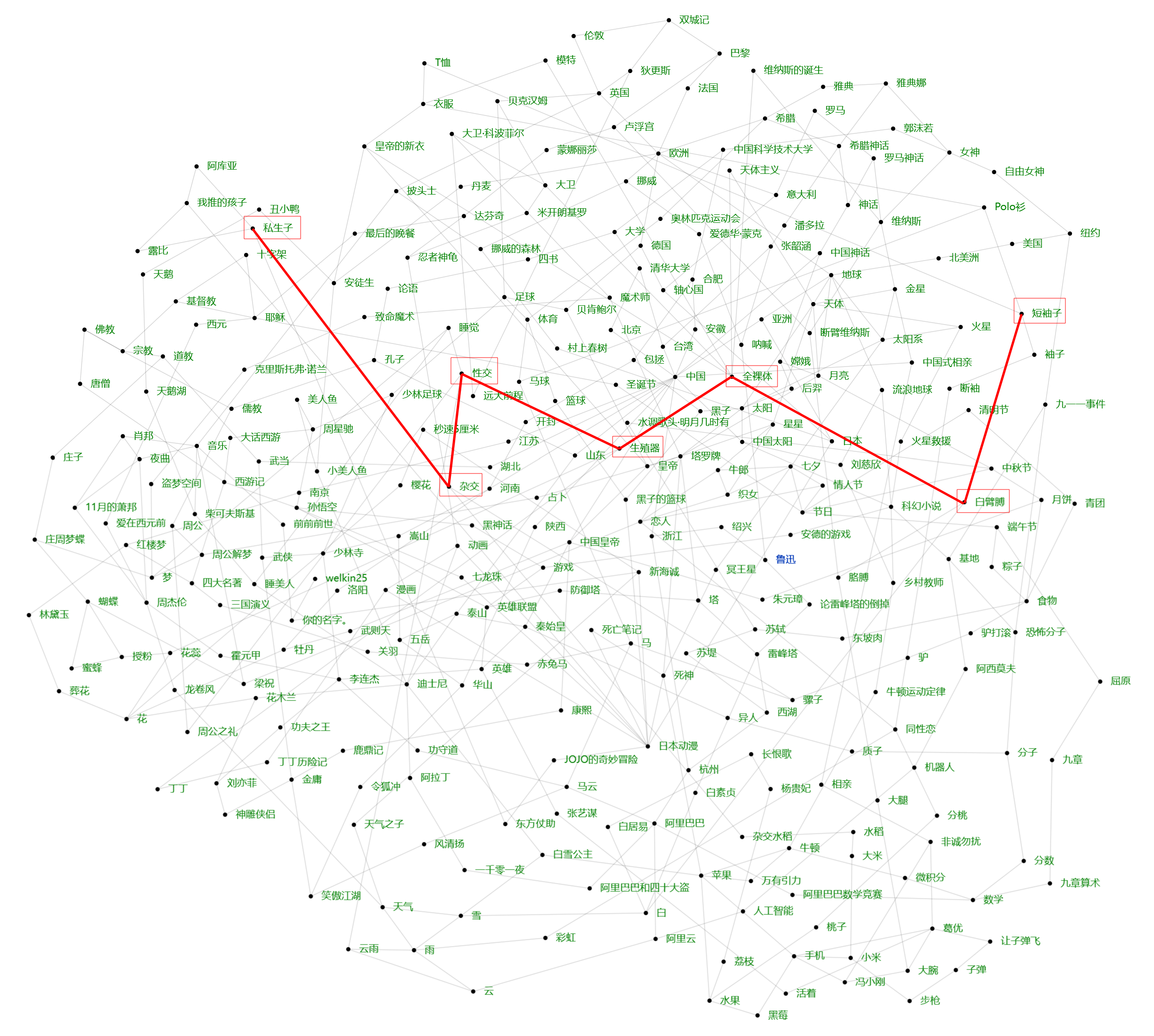 “鲁迅”这个词与众不同地被标成了蓝色。在填的过程中,玩家还会注意到这里的词一反常态地包括不少不和谐词,比如“生殖器”“性交”等,而且这些本应密切相关的词之间却没有连线。如果搜一下这些词,或稍作联想,就能发现它们来自鲁迅《小杂感》的一句名言: